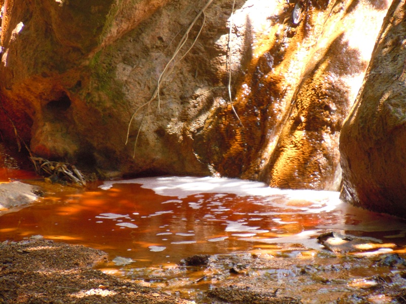 “I’ve seen this water also cranberry red and also bright yellow,” our companion responds. But then she quickly adds: “Remember: don’t touch the water. Last time I was here, I slipped and ended up with rashes all over my leg and stomach where I got wet.” She doesn’t need to remind us. Experts from the Salvadoran government’s Ministry of the Environment and Natural Resources were here in July 2012 and they found levels of cyanide and iron that were through the roof.
