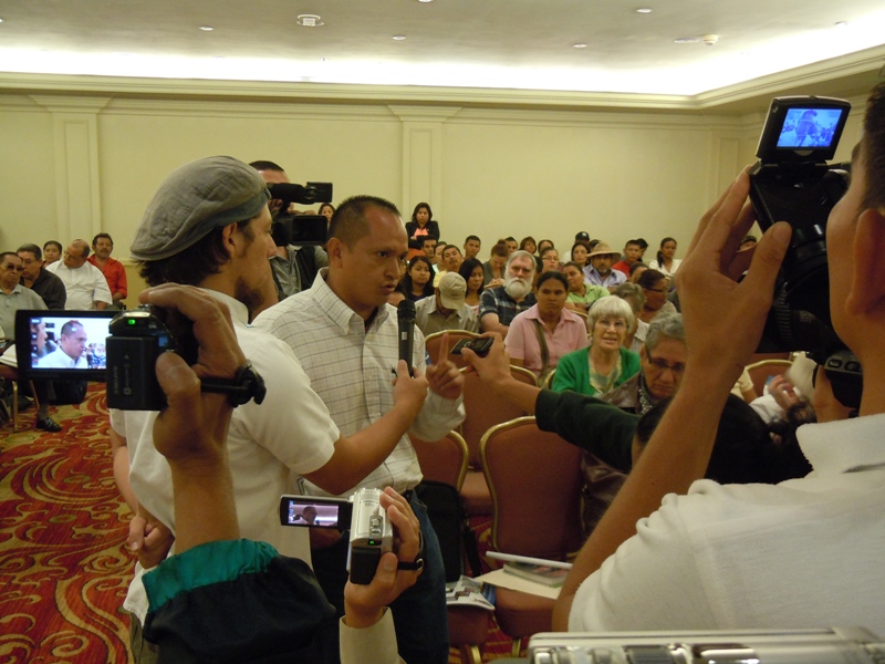 Things started heating up when it was Orlando Arevalo’s turn to speak. Rep. Arevalo has played important role in mining history in El Salvador and was the Representative who introduced the bill on behalf of the mining companies to ease mining restrictions El Salvador. At the event he said he now recognizes the dangers of mining, but that all the developed nations depended on mining to come to wealth. He also said that in life there is “your truth, my truth and the real truth.” His solution for the mining issue is that El Salvador needs to pass a constitutional reform that would allow referendums. Then there should be a referendum on population’s opinion on a mining ban. He said he would not vote on the issue until the people had been consulted. When questioned about the bill he presented in 2006, he said that he didn’t introduce it because it was his personal belief, but because he was representing his party as a whole, a statement which received jeers and laughter of disbelief from the crowd.